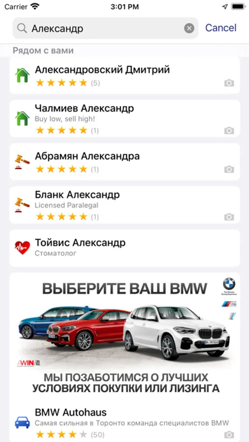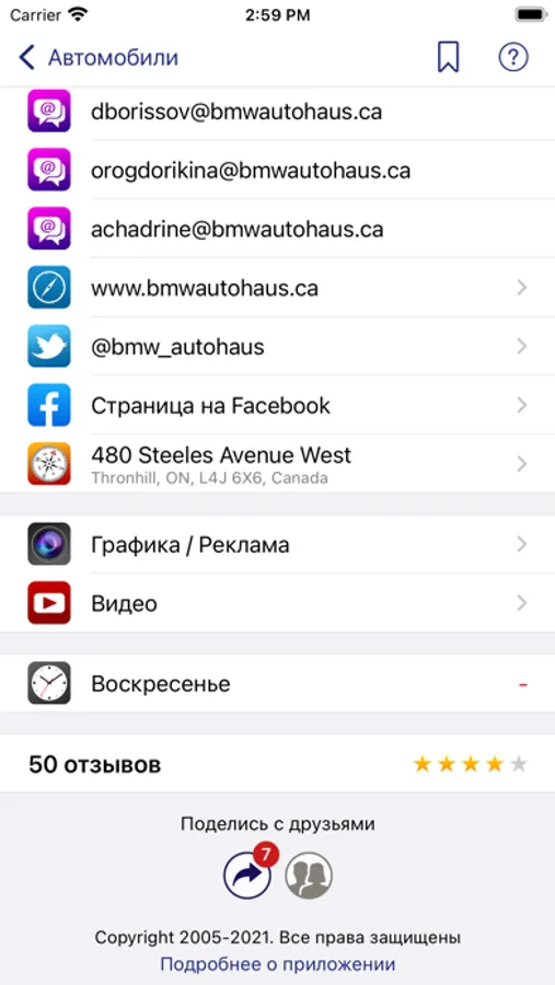 Справочник - одно из самых полезных приложений для русскоговорящего населения и гостей США и Канады - в нужный момент вы мгновенно найдёте исчерпывающую актуальную информацию о компаниях рядом с вами, их предложениях и контактах. Вы сможете всего в 4 нажатия не только набрать номер телефона, просмотреть подробное описание товаров и услуг, а и открыть карту с указанием точного расположения бизнеса, посмотреть графику и фотографии, видео, позвонить по Skype или FaceTime, задать вопрос по e-mail и поделиться понравившейся информацией в социальных сетях, добавить её в адресную книгу, узнать отзывы, график работы и персонал компании.