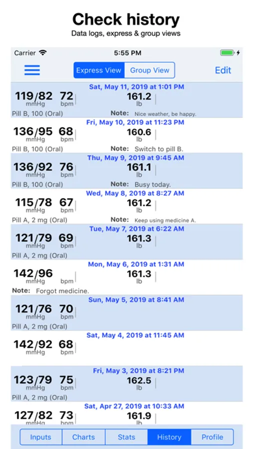 Data Visualization – a chart is worth a thousand words. The graphical charts not only give you a visual trend of the vital signs, but also show warning signs (BP only).