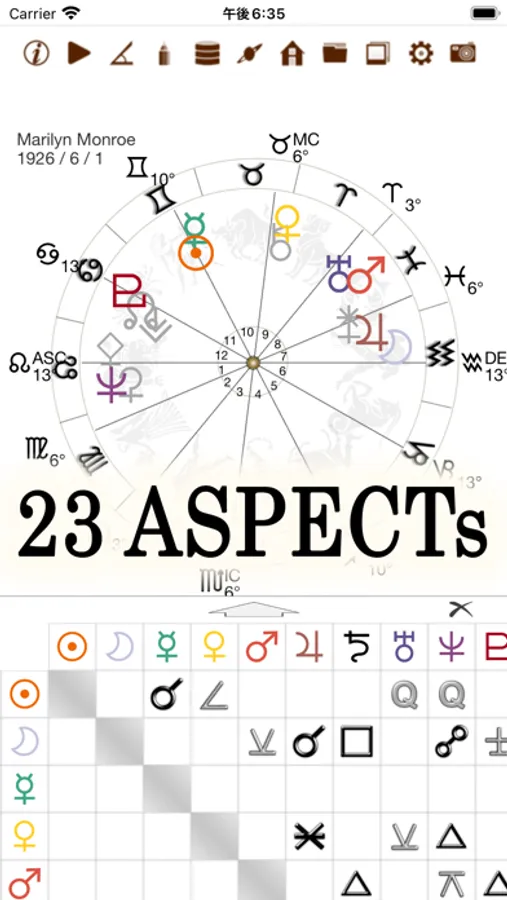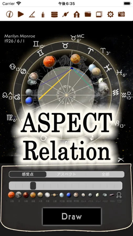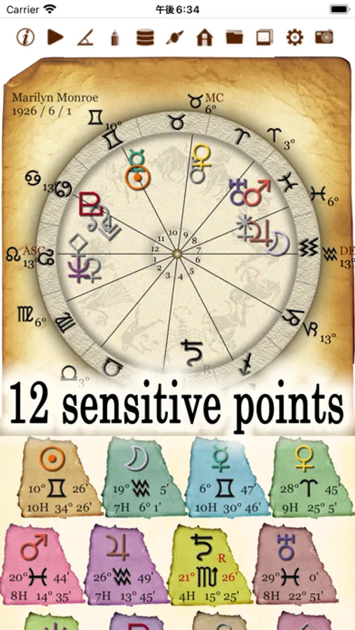 A horoscope is drawn 21 sensitive points: 15 sensitive points by planets and asteroids in the solar system and 6 sensitive points by DH, DT, MC, IC, ASC, and DSC.