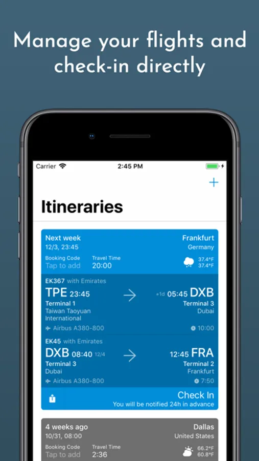 Keep track of your itineraries. Find out how to get to the airport and which terminal your leaving. Check the weather at your destination. And never forget to check-in for your flight in time because we'll send you a notification. Replace all your mobile check-in bookmarks and apps with one universal app.
