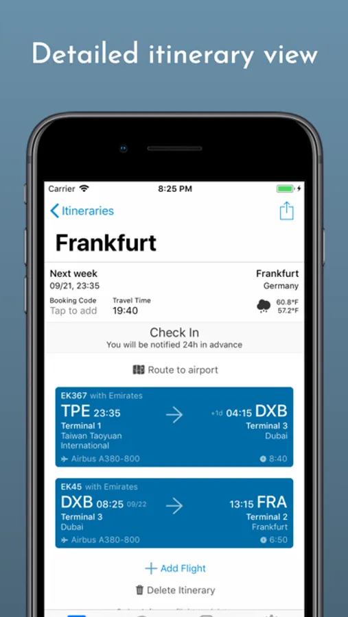 Quickly add itineraries with just a couple of taps using our smart input form which knows about almost all popular flights.