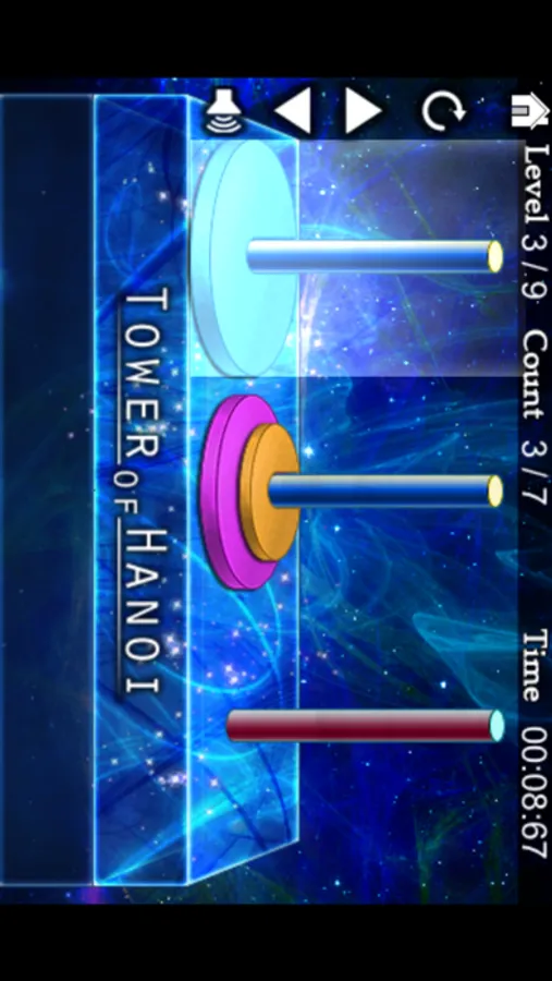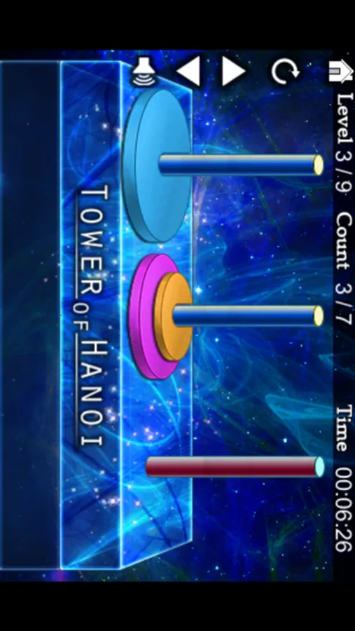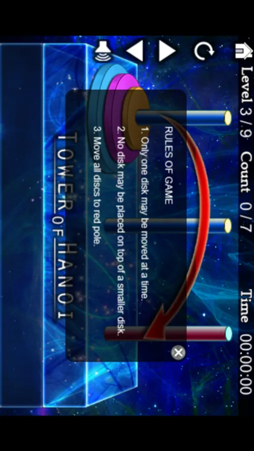 The objective of the puzzle is to move the entire stack to the red rod, obeying the following rules: