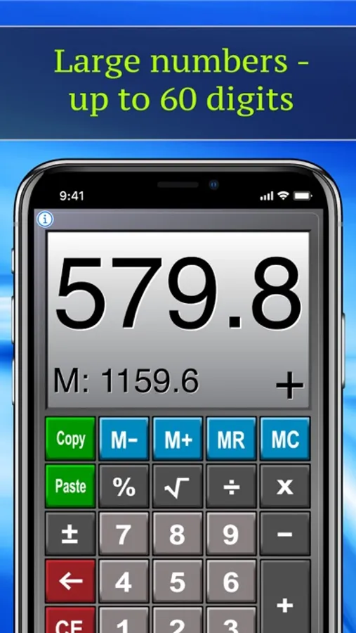 - Can handle very large numbers - up to 60 digits! (never displays in scientific notation)