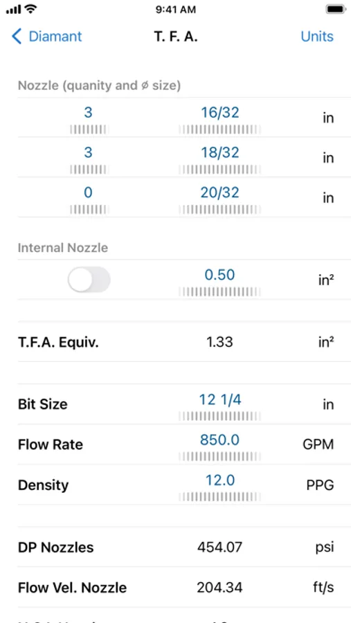 The DDS iTool is designed to provide TFA, pressure drop, jet impact velocity, internal nozzle, Hydraulic Horsepower created at a nozzle orifice, which is installed in a drilling bit during earth-boring operations that can easily be calculated from easily entered information by the user.