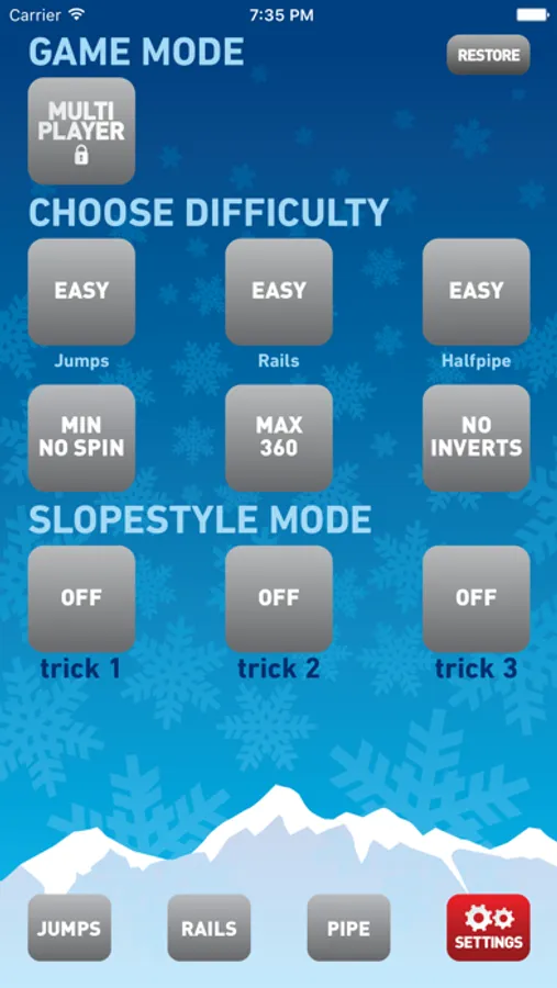 Now you can choose up to 3 tricks in a row to roll. Jump, rail to jump, an all rail jib session or any combo of your choosing. Practice going back to back tricks down the park as you roll the dice and swipe along to see your line. The app automatically realizes if you come in switch from a feature to hit the next feature the same way so no more reverting around. Your now set to go, challenge yourself and become a better slope style rider.