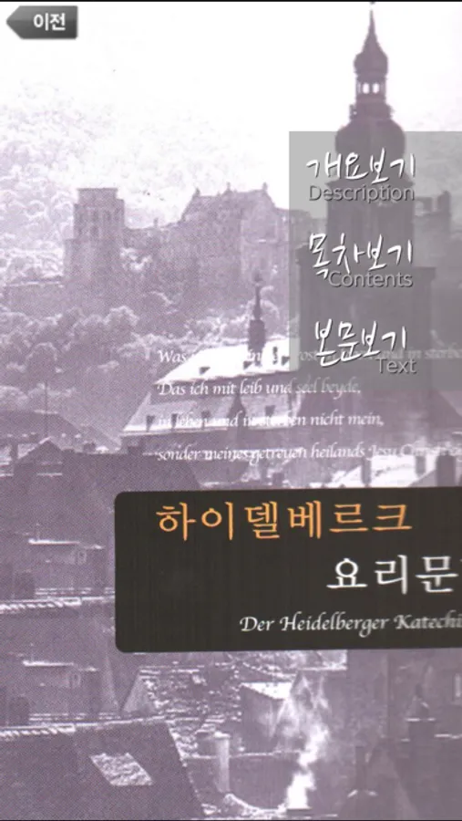 위 8개의 교리문답 모두 한글(독일어)보기와 영어보기, 그리고 영한대역 보기를 선택할 수 있으며, 가로보기 모드를 지원 합니다.