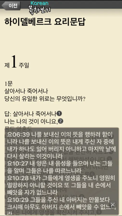 각 교리문답은 성경을 기준으로 만들어진 바, 교리문답에는 성경의 증거구절들이 모두 기록되어 있습니다. 이번 버전에서는 하이델베르그 요리문답만 증거성구 보기기능을 지원합니다.