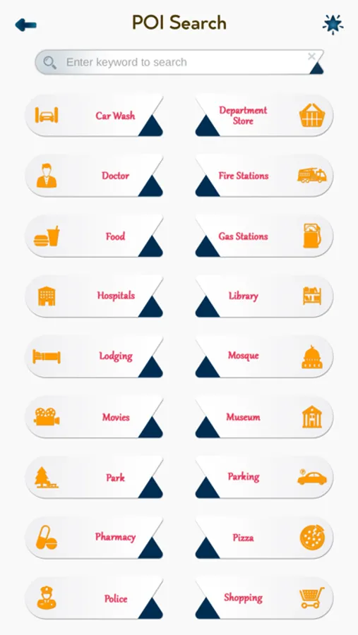 Airport, ATM, Bank, Bars, Beauty Salon, Bus Station, Cafe, Campground, Car Wash, Department Store, Doctor, Fire Station, Food, Gas Station, Hospital, Library,Lodging, Mosque, Movies, Museum, Park, Parking, Pharmacy, Pizza, Police, Shopping, Stadium, Taxi, Train Station, Travel Agency, University, Zoo.