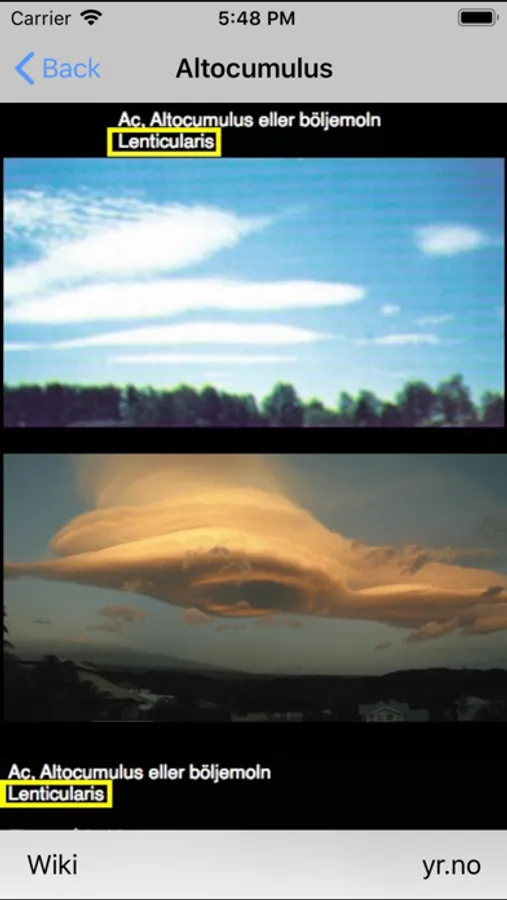 -För varje molntyp finns en länk till Wikipedia för att inhämta relaterad information samt en länk till yr.no för aktuellt väder och prognos.