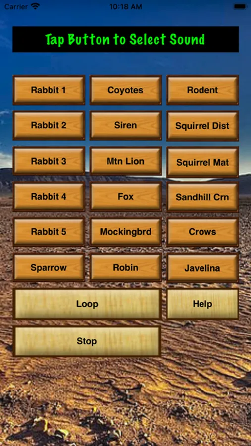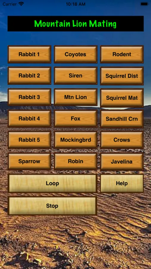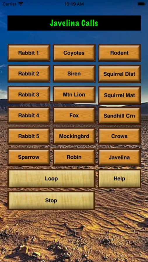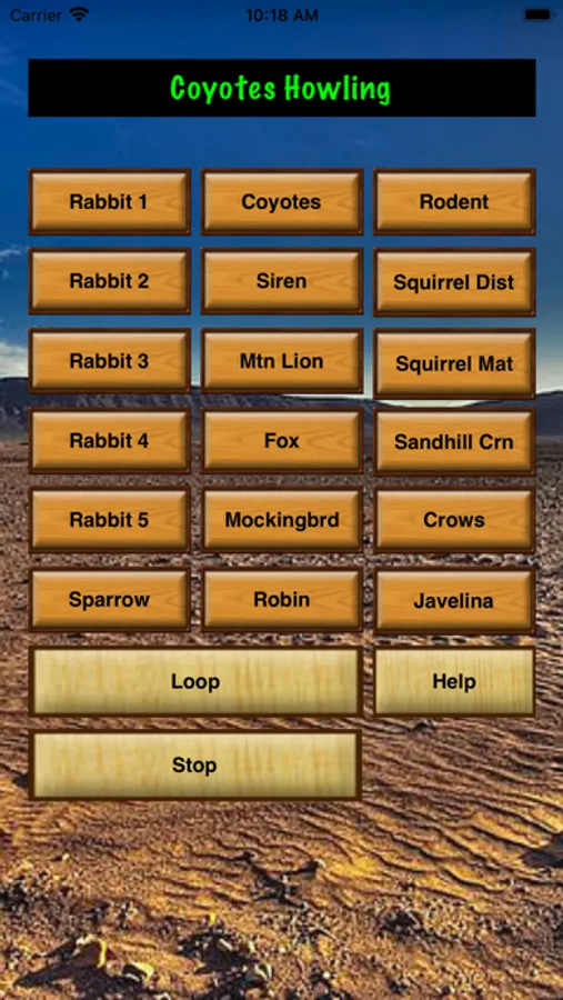 Download this app for success in calling coyotes, foxes, bobcats, wolves, and other predators as well as squirrels, sandhill cranes and javelina in. Field proven. Unlike other predator calling apps on the market, this one was designed with you, the hunter in mind. Everything is on one screen. When you're out in cold weather, the last thing you want to be doing is navigating through many screens to get to the sounds and controls. This app solves that problem.