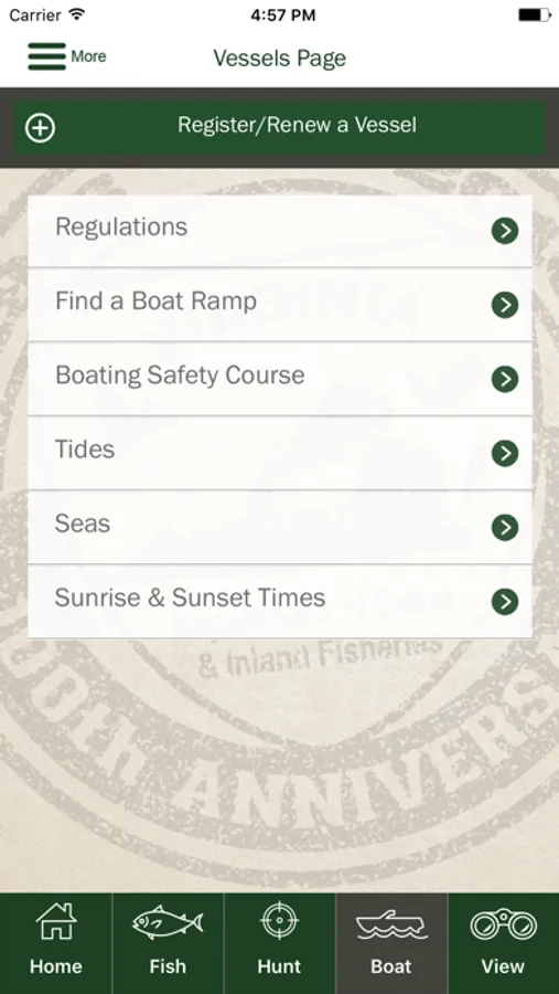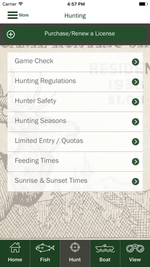 - Access to hunting and fishing regulations, season and bag limit information, and state record fish