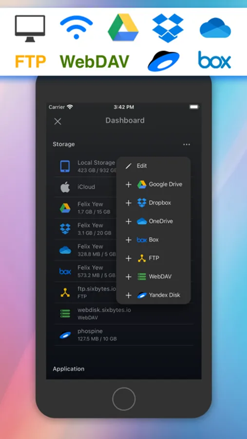 Connect to multiple Dropbox, Google Drive, OneDrive, Box Drive, FTP, WebDAV, Yandex Disk, and iCloud Drive storage accounts. (*additional in-app purchase required)