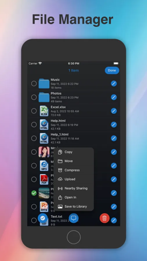 Share files with other iPhone/iPad devices via Bluetooth or Wi-Fi, with automatic search for nearby available devices.