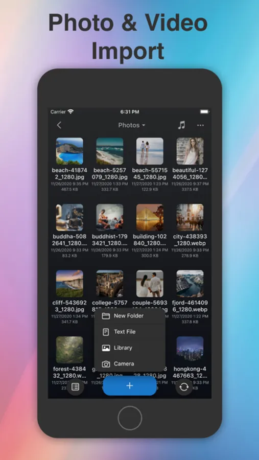 Create text files, capture images, record videos or voice memos, and import pictures from your photo library.