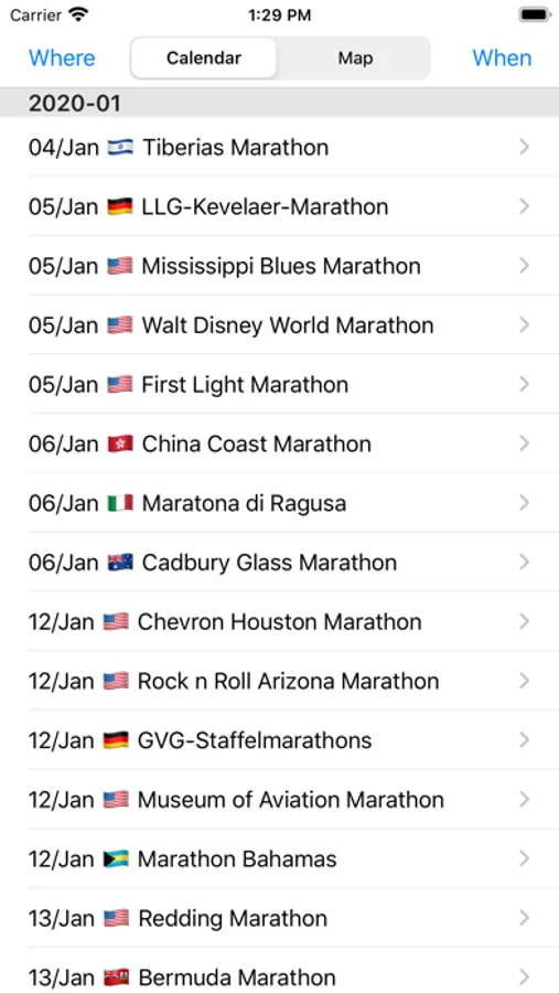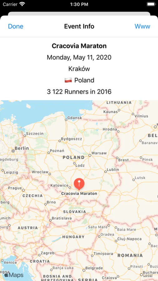 The app lists a marathons from a database and present in table or on a map. Events can be filtered by a region and a date.