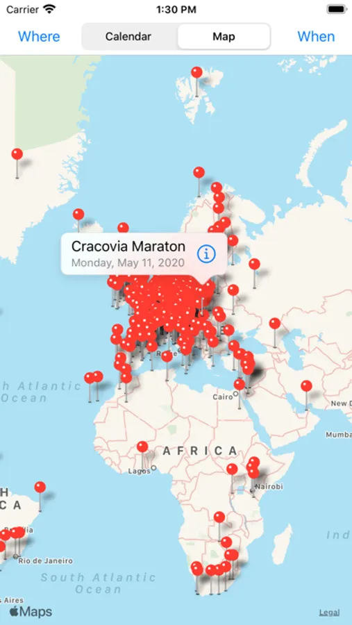 Marathon42k is a calendar and a map of international marathons (the race take a place in the capital city or has five hundred or more participants).