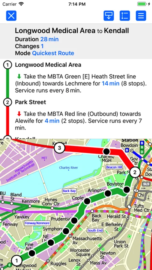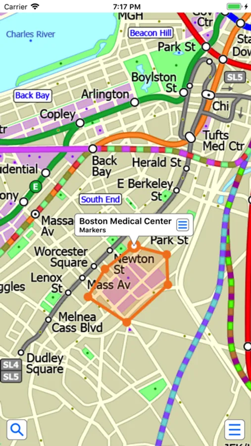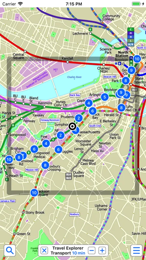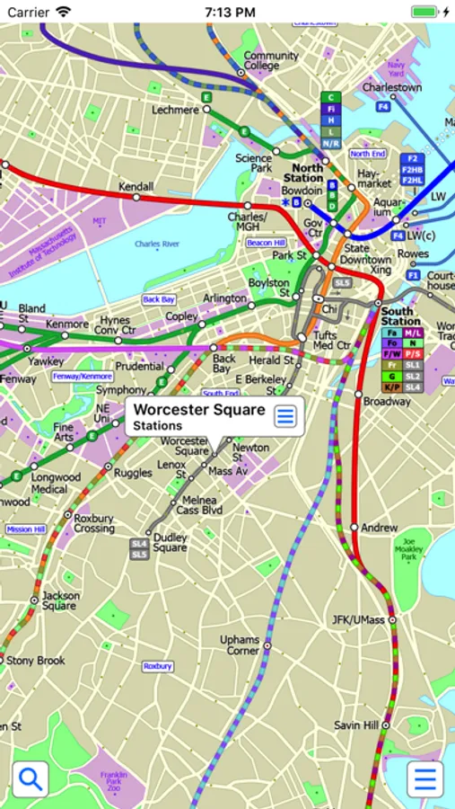 The map is hand drawn by Visual IT and provides a unique geographically based view of Boston with many places of interest drawn directly on the background so you can easily get your bearings when traveling around the city. You can also use your inbuilt GPS to accurately locate and track yourself within the city centre and see the nearest transportation stop and distance to it. This is the only public transportation route planner with this ability.