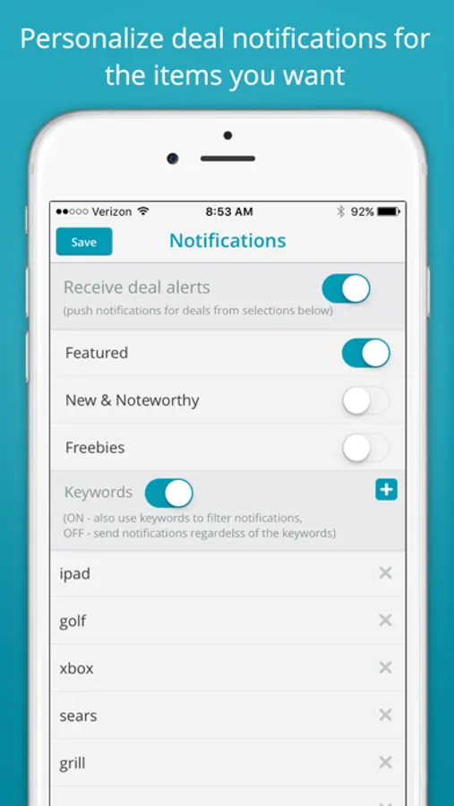 ● Deal notifications. Saviry will notify you as soon as new deals appear (based on your keywords selection). Know about the newest deals first.