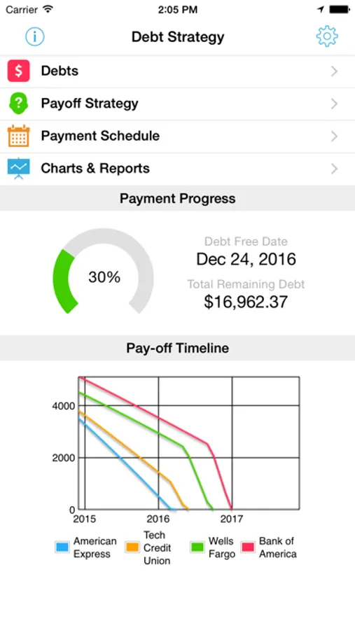 Debt Strategy helps you identify the best payoff strategy in order to pay down your debts fast. It also helps you track and pay off your debts, and execute on the strategy you choose. After entering your debts in the application, you can analyze how the choice of payment strategy or different extra amounts helps you pay off your debts sooner, and save on the total interest paid. Debt Strategy supports multiple strategies such as: