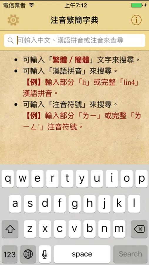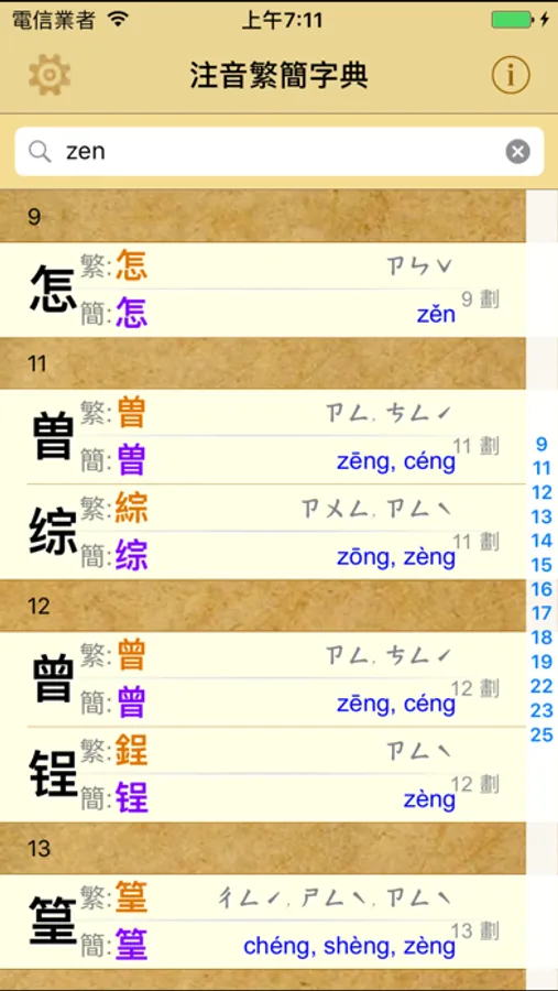 3.可輸入「注音符號」的部份或全部注音來搜尋(找到文字以筆劃分類)。