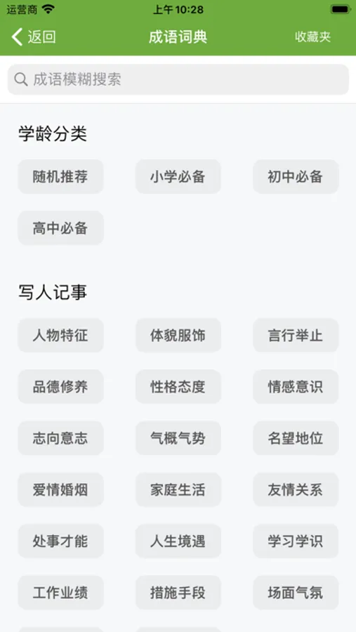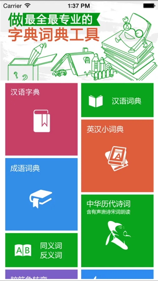APP包含了汉语字典、汉语词典、英汉小词典、成语词典、同义词和反义词、中国历代诗词,经典歇后语,脑筋急转、绕口令、名言名句等10多大版块。