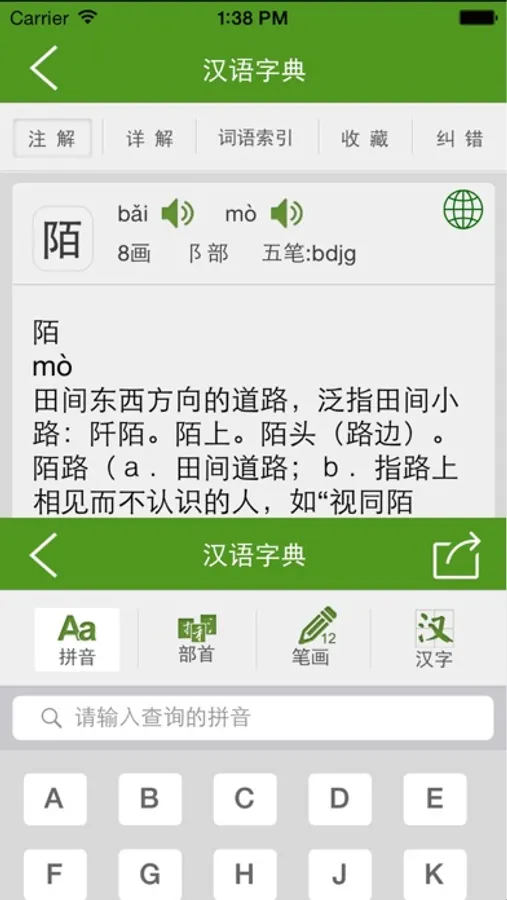 40万海量汉语词典,包括了汉语所有的词汇,它将是你日常生活和学习重要的工具。词典含简体和繁体,拼音和解释。