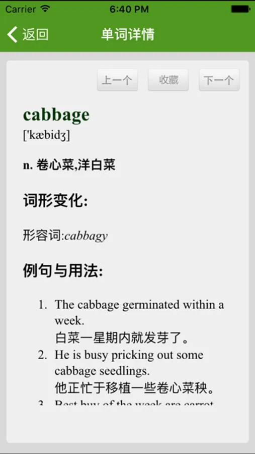 3、单词提供非常详尽的内容介绍:单词属性介绍、音标、用法和例句、词形变化、详尽的解释 。