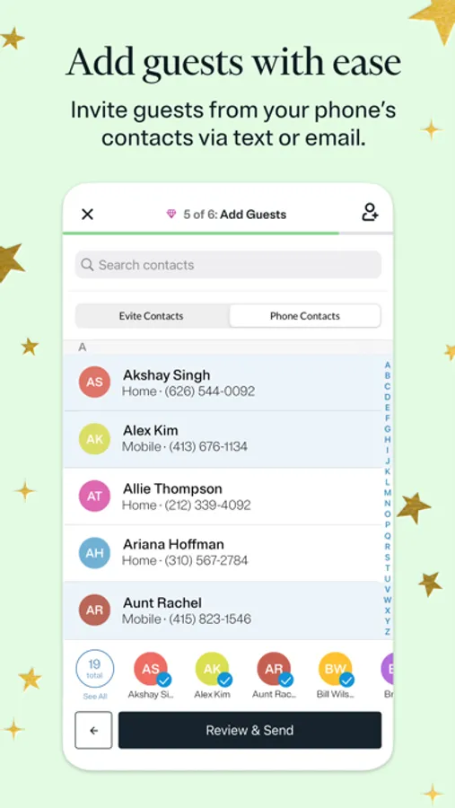 • Text invitations or email invitations by choosing guests from your phone contacts or Evite contacts. You can also send invitations on social media with a shareable link!