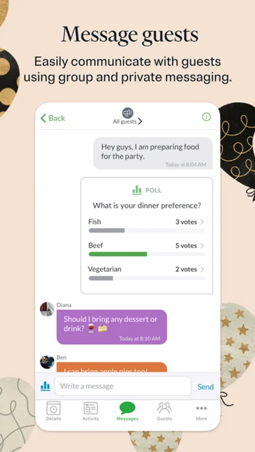 • Send messages, sign-up lists, and polls to guests directly or in custom groups.