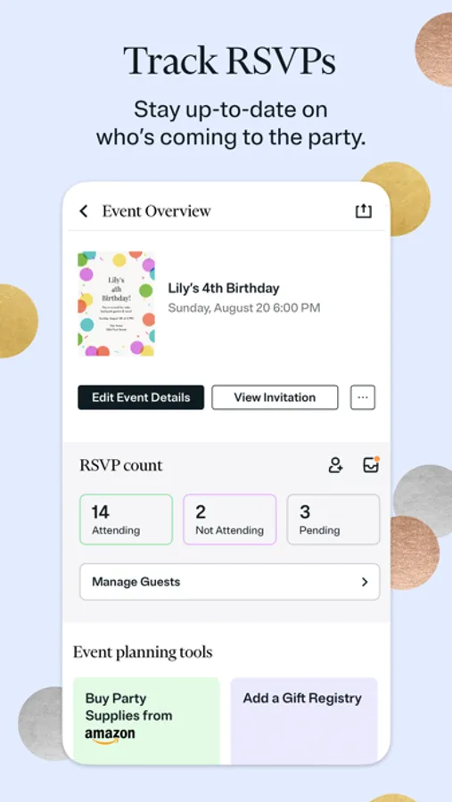 • View event details and stay up to date at any time, even when on the go, so you’ll never miss an update about the party.