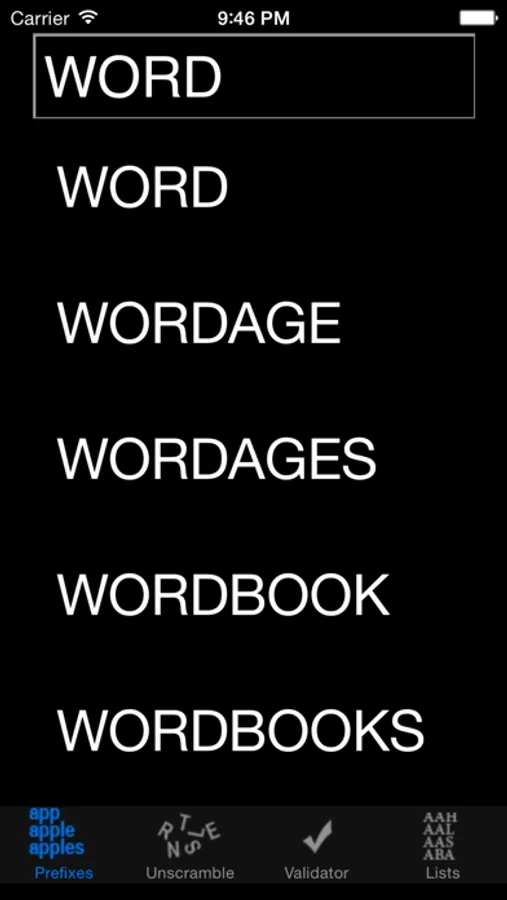 Looking up all words that start with a prefix is incredibly useful. With this feature, WordWhiz will list all words that start with certain given letters. It can help you come up with word extensions for scramble boards. It can help you discover words on a Boggle board, by trying out combos and seeing what works. In fact, many users enjoy this feature just to experiment and discover new words!
