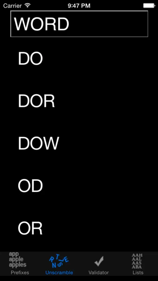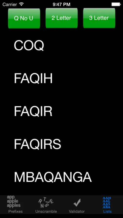 WordWhiz allows you to Unscramble letters, look up words from a Prefix, or Validate if a word exists. It also contains some helpful word Lists, such as 2 and 3 letter words and words with a Q but no U. WordWhiz uses TWL06 as its source of words.