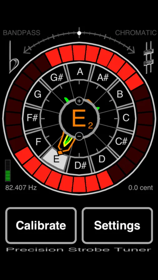 As the input approaches the desired Note, a Two Group pinwheel pattern becomes visible rotating in the Strobe Display. Fine tuning is accomplished by adjusting to stop rotation. The Strobe Display responds instantaneously to changes in pitch and is extremely sensitive. The outside Strobe Display works just like a classic rotating disk strobe tuner. The Two-Group pattern rotates CCW when the input is flat, and CW when sharp. When the rotation is stopped, the note is in tune.