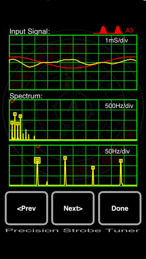 The central Spectrum Display shows the input spectrum wrapped around the Display, with each Octave drawn in a separate color. The Note Dial is marked like a clock with the twelve notes of the Scale. All overtones of the input are shown as peaks in the Spectrum Display pointing towards their corresponding Notes. The Fundamental Indicator Tic on the Spectrum Display shows the Note of the Fundamental along the Note Dial, with the color designating the Octave. Use the Spectrum Display for coarse adjustment by tuning the Fundamental to the center of the desired Note Indicator.