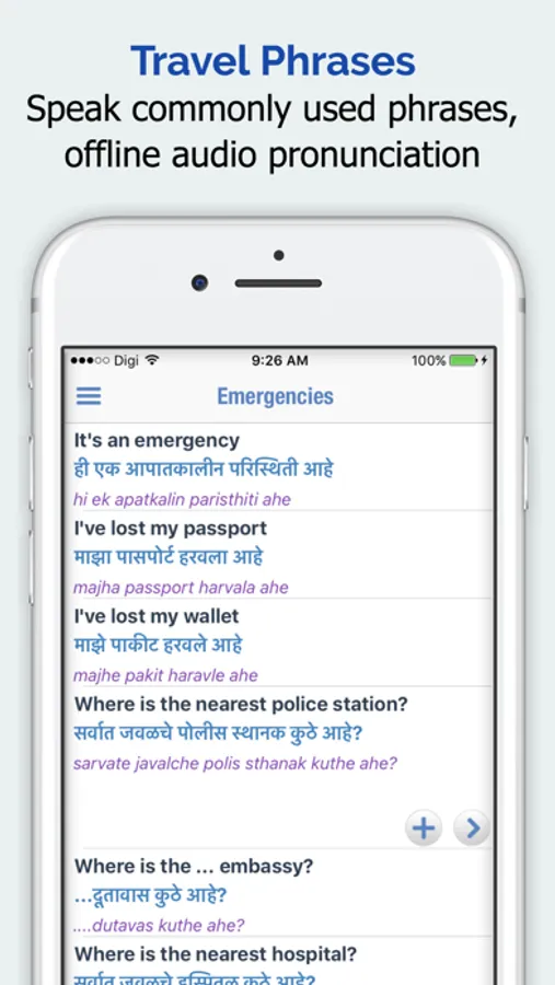 • Phrase book, Phrase of the day and Phrase Card helps to speak common phrases