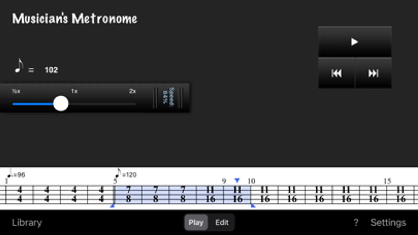 Musician's Metronome is a high precision, advanced, yet easy to use metronome. In its simplest form, it plays rhythms just like any other metronome. You can, however, also play complex rhythms very easily. It gets even better when your music has many different time signatures and tempos. The user interface of this metronome is designed in such a way that you can enter music very rapidly: after setting up the preset buttons, a single tap will add a new measure with the desired time signature.