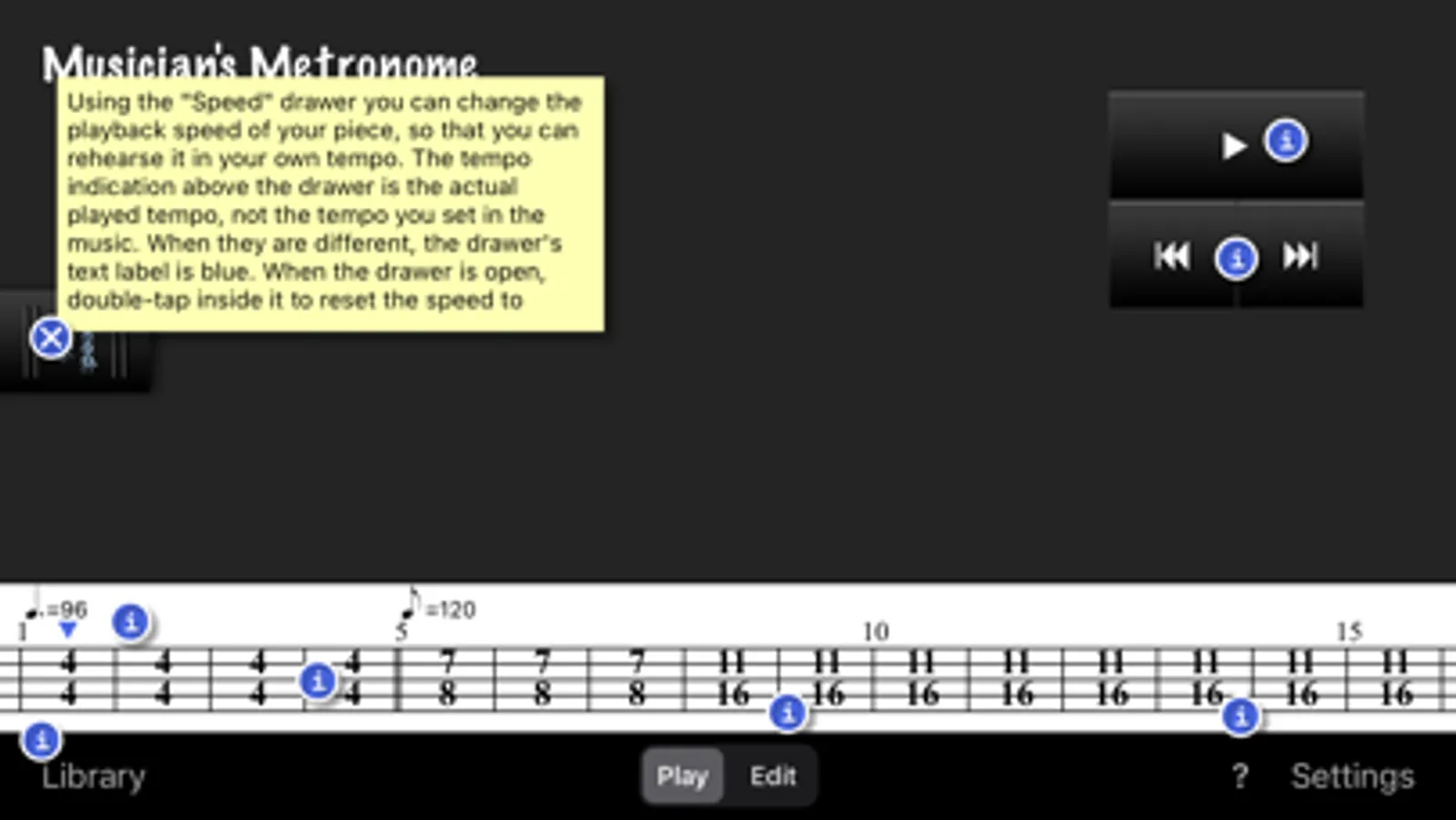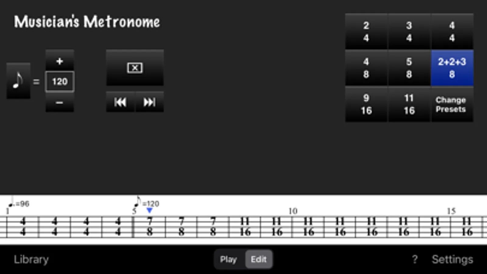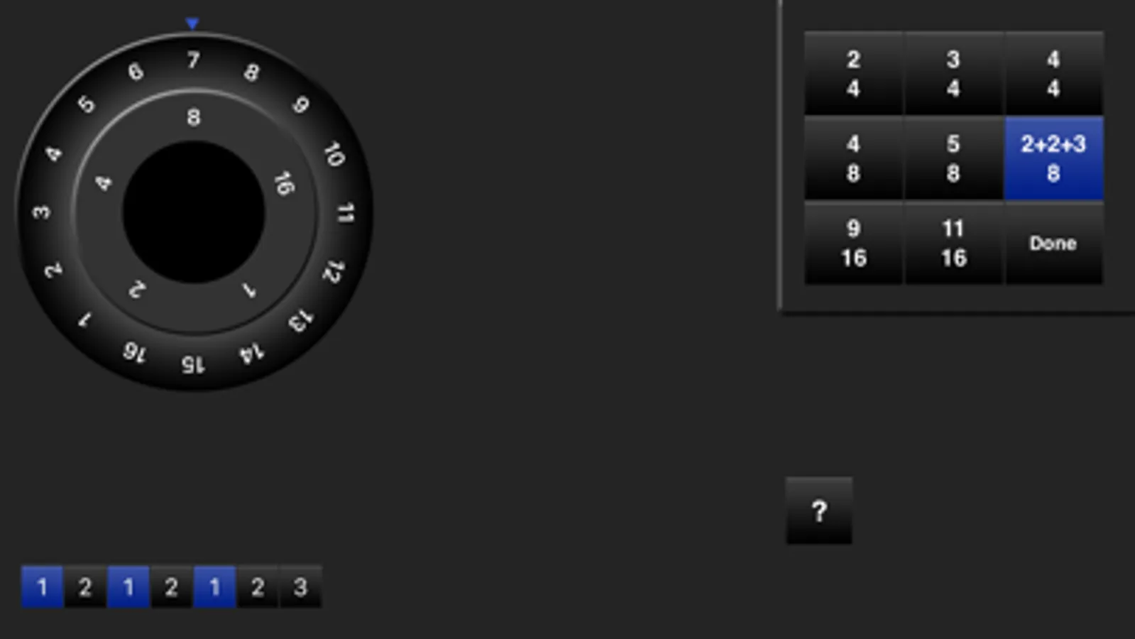 You can set up the time signature preset buttons for every piece. Using the two wheels, you can choose the number of beats in the measure, and the beat duration. Using the buttons at the bottom of the screen, you can indicate the accents in the measure. The numbers on the buttons indicate how the measure should be counted. These accents play with a different sound, so that you can actually hear the difference between 7/8 that is played as 2+2+3 and one that is played as 3+2+2.