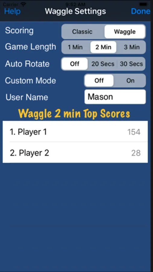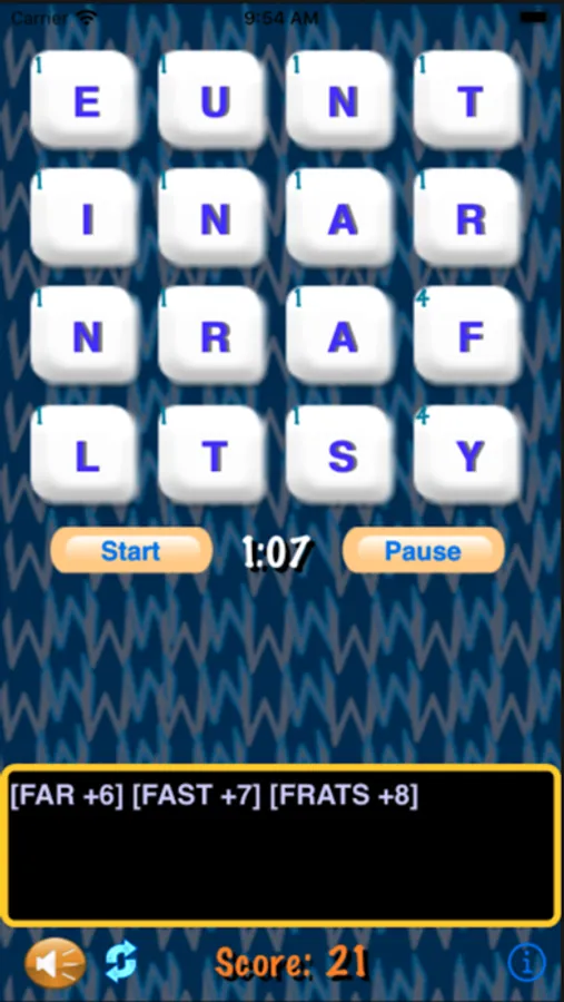 Word Waggle is the word game for enthusiasts who love to challenge their mind. Slide your finger across the 4x4 grid to form words with neighboring letters. Score as many points as possible in the allotted time period by choosing from a 1, 2, or 3 minute game. Scoring is determined by the number of words found, word length, and scoring style.
