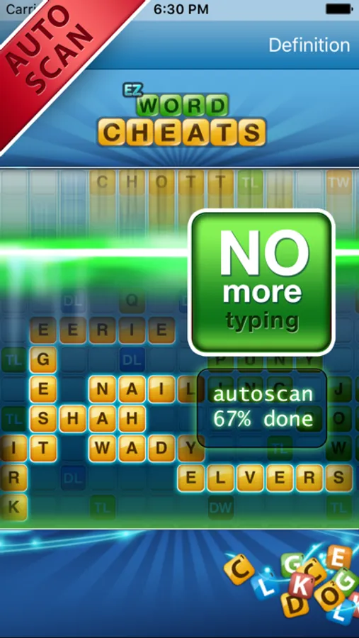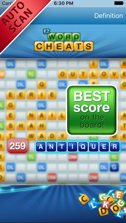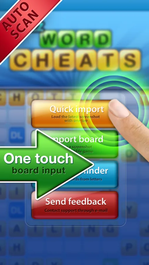 An ad-free, smart cheat app for Words With Friends and Scrabble. We automatically input the board and find the best moves for you! Now you can cheat or play jokes on your friends by making 80 point moves, or improve your skills using the built-in dictionary and anagram finder.