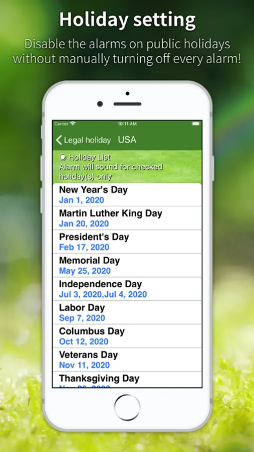 * Have you ever seen an alarm application that doesn’t go off during holidays, even if you forgot to turn it off?? Now you can sleep in!!!