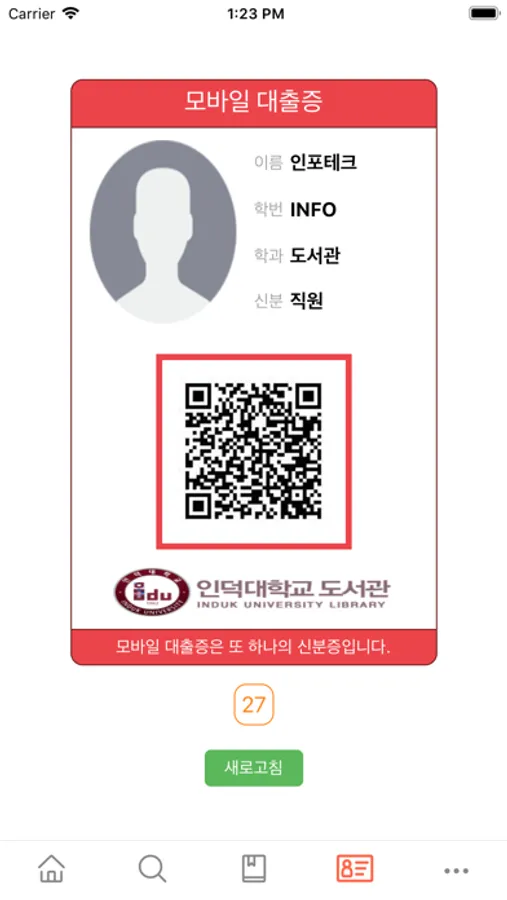 - 카메라: 도서 ISBN 바코드 인식 및 이용자 사진 정보 개인화 기능 제공