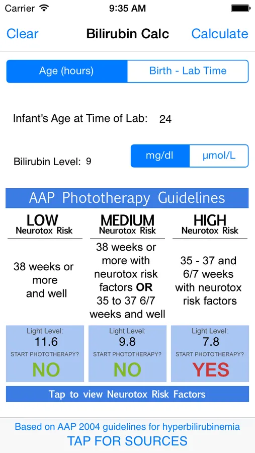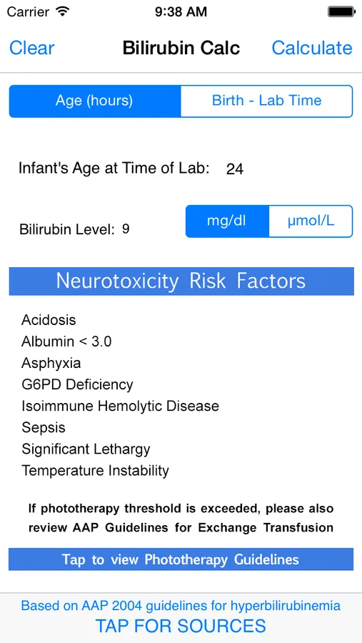 Allows direct age input and includes the option to calculate age from birth and lab sample times. The app has a direct link to source journal articles, nomograms, and a list of the neurotoxicity risk factors. Supports US and SI units (mg/dL and µmol/L).