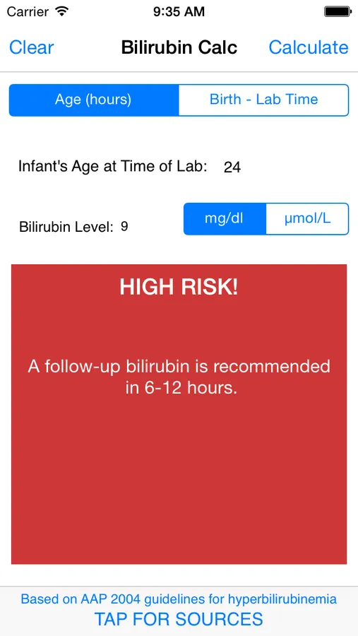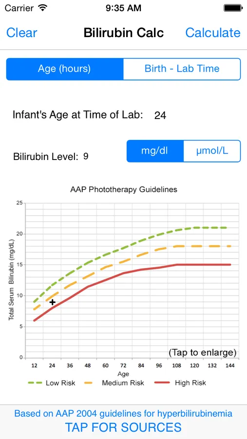 Designed by a pediatrician, BiliCalc uses the American Academy of Pediatrics 2004 "Management of Hyperbilirubinemia in Infants Greater than 35 Weeks of Age" to calculate the threshold for starting phototherapy based on the patient's age, bilirubin level, and neurotoxicity risk. Values are now displayed on the phototherapy nomogram. In addition, it will also tell you the patient's risk zone using the Bhutani Nomogram.