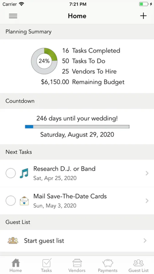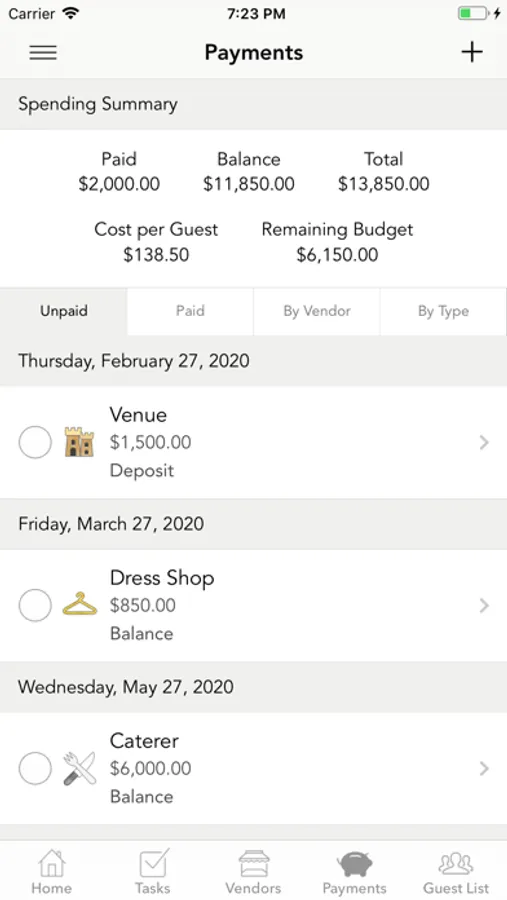 - Spending summary. Measure your spending. See how much budget you have remaining and your current cost per guest.