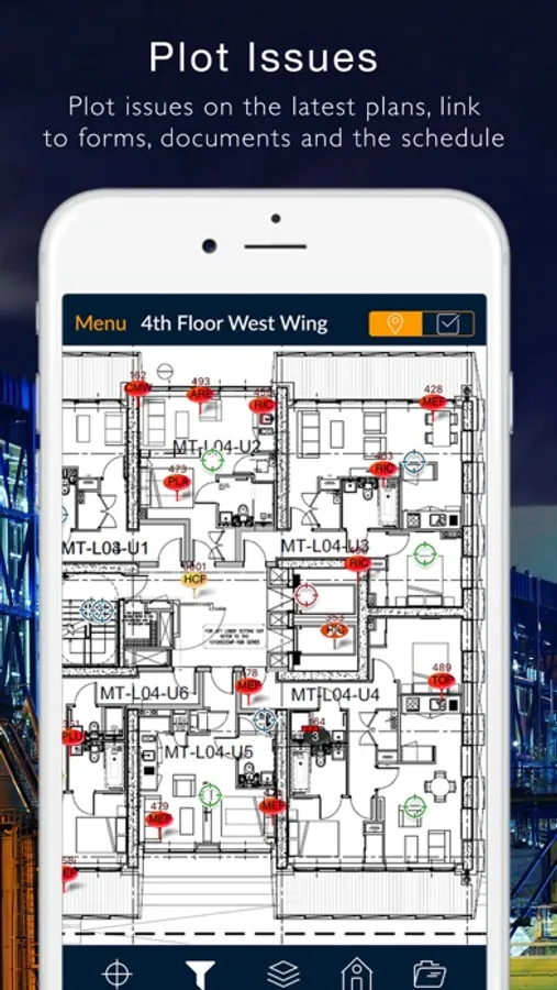 snagR offers a simple and accessible way of plotting work using visual symbols in exact locations of the construction site. Symbols, descriptions, assignments, photos (with markup), due by dates, signatures and attached documents are used to accurately define the work that has been done or needs to be done.