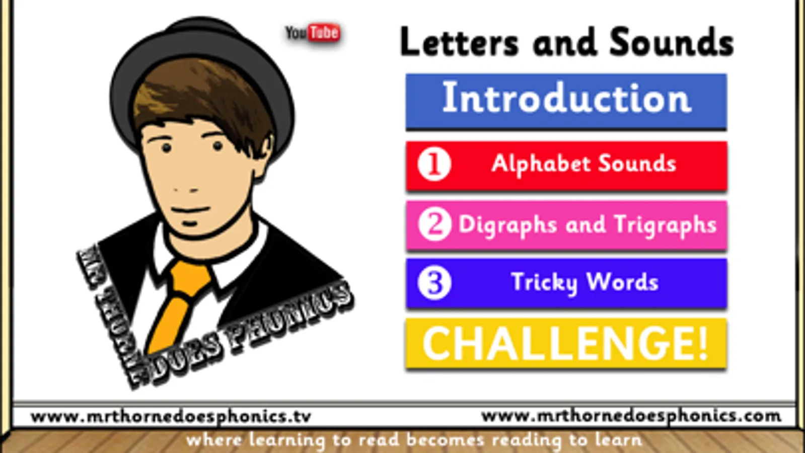 'Mr Thorne Does Phonics: Letters and Sounds' - The Youtube sensation Mr Thorne Does Phonics presents a comprehensive collection of over 70 literacy videos for children, parents, teachers, student teachers and anyone learning to read English, using the synthetic phonics approach to learning to read.
