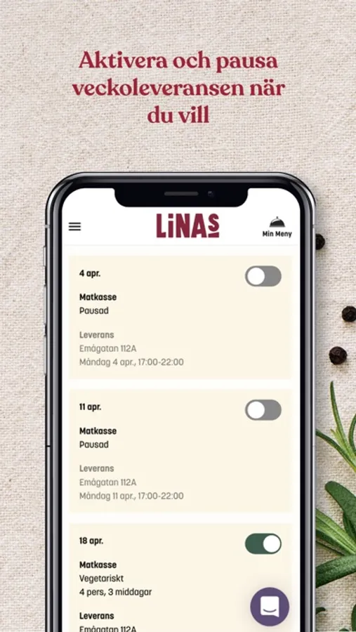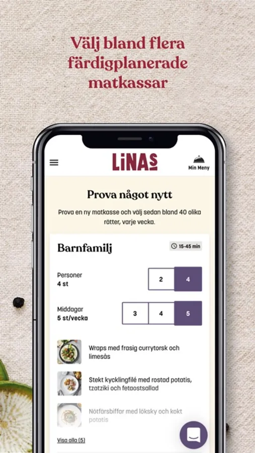 Funderar du också på vad du ska laga till middag? Med Linas Matkasse får du enkelt hem recept och ingredienser till goda, inspirerande och varierande vardagsmiddagar. Unna dig mer fritid i vardagen så sköter Linas Matkasse din middagsplanering!