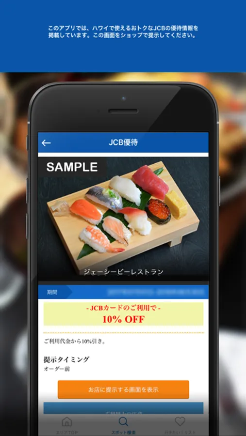 JCBカードをご利用の際、「お店に提示する画面を表示」画面を提示いただくと、割引サービスやプレゼントなどの優待が受けられます。