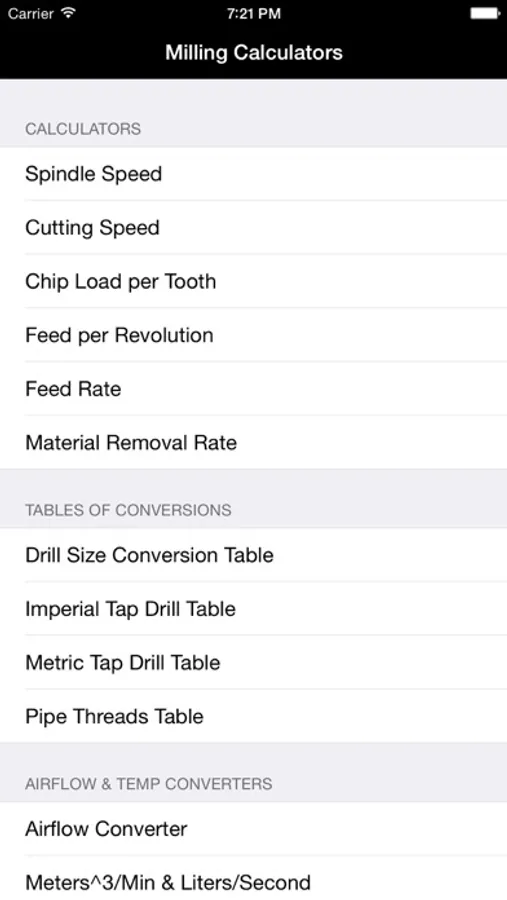 The Milling and Machining app is six, easy-to-use calculators for milling in metalworking and woodworking projects. Also, included are tables for reference.