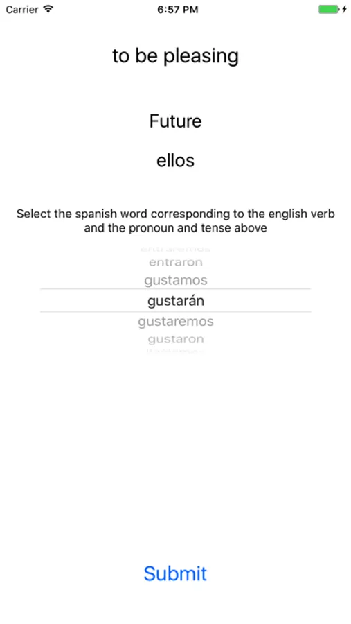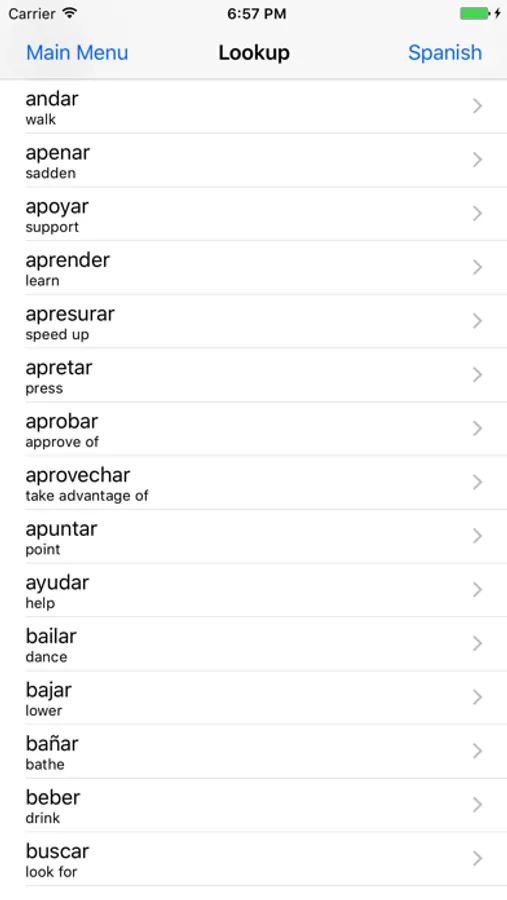 Lookup over 200+ verb conjugations. The basic app allows you to test yourself on over 40 verbs and conjugations for present, preterit, future, infinitive, past participle, and gerund tenses.